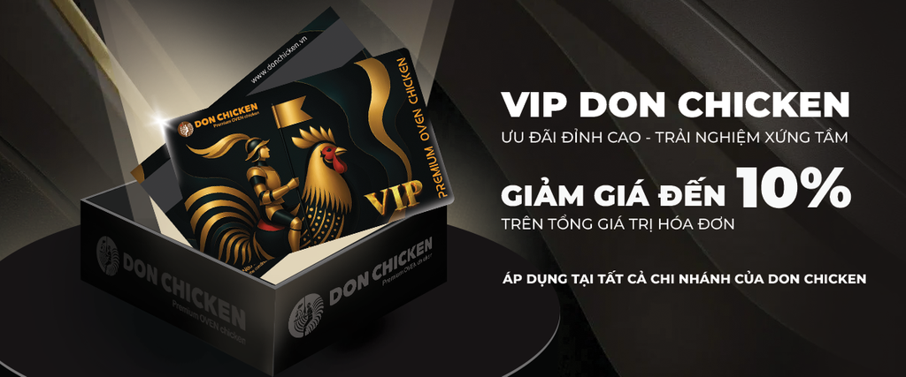 - Thẻ VIP DON CHICKEN không chỉ đơn thuần là một chương trình ưu đãi, mà còn là sự tri ân đặc biệt gửi đến những đối tác chiến lược và khách hàng doanh nghiệp đã luôn đồng hành cùng DON CHICKEN trong hành trình phát triển.